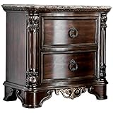 King upholstered platform bed in cappuccino. With a strong, transitional silhouette enhanced by a rich, sumptuous cappuccino finish, it exudes effortless style and glamorous appeal. Features a cappuccino finish and faux marble top. Offers 2 drawers with dovetail construction. Benzara 2 drawer wooden nightstand with faux marble top, cappuccino brown.